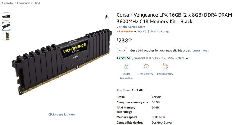 Corsair Vengeance LPX 16GB (2 x 8GB) DDR4 DRAM 3600MHz C18 Memory Kit - Black