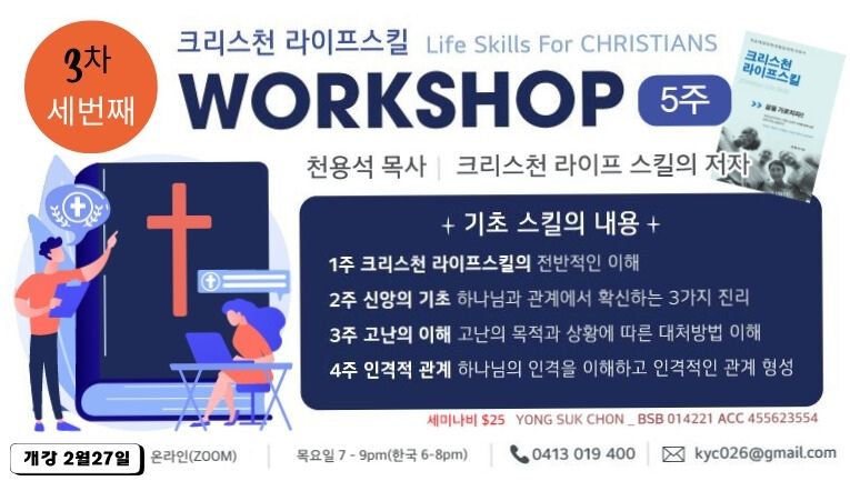 세미나 참가비용은 책값 $25입니다. 저의 책 ‘크리스천 라이프스킬’을 우송해드리겠습니다.