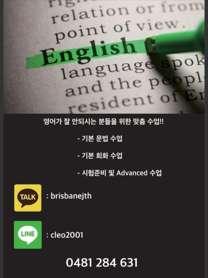호주에서 공부하거나 일하면서 영어 때문에 어려움을 느끼는 분들, 영어 실력을 확실히 올리고 싶은 분들을 위해 영어 과외를 진행하고 있습니다.