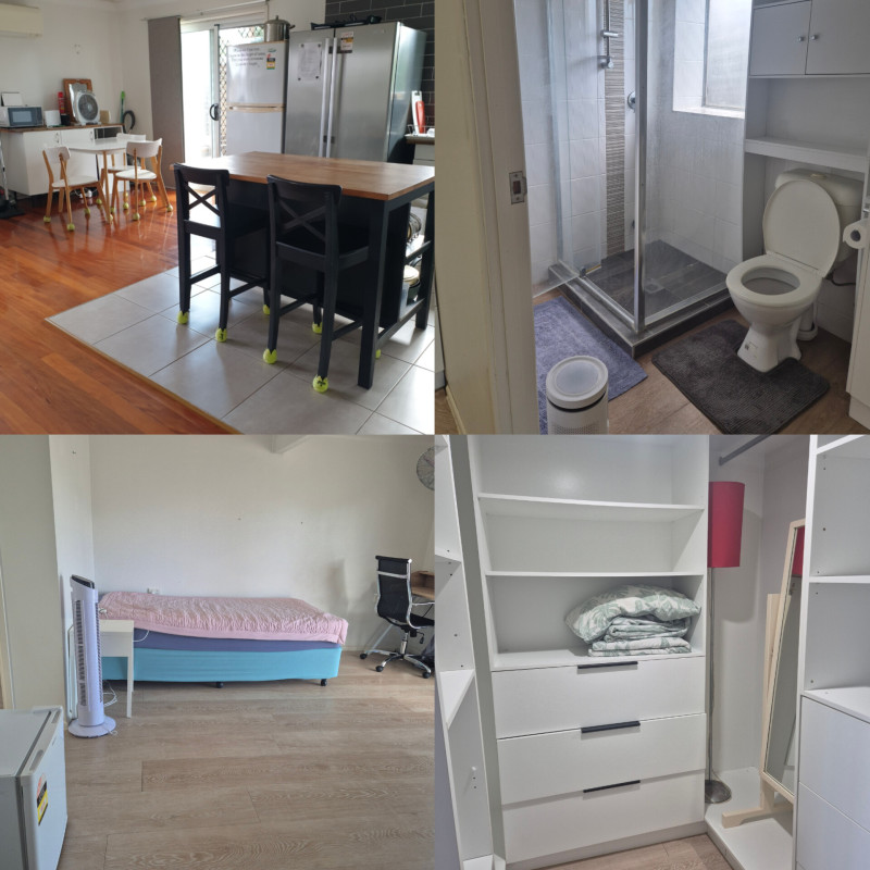 작은 드레스룸이 따로 있는 아늑한 마스터룸 입니다. 혼자 지내시기 넓고 너무 좋은 공간입니다 주방은 5분이 사용하시고 방에 작은 냉장고,제습기가 지내시기 쾌적한 환경입니다.