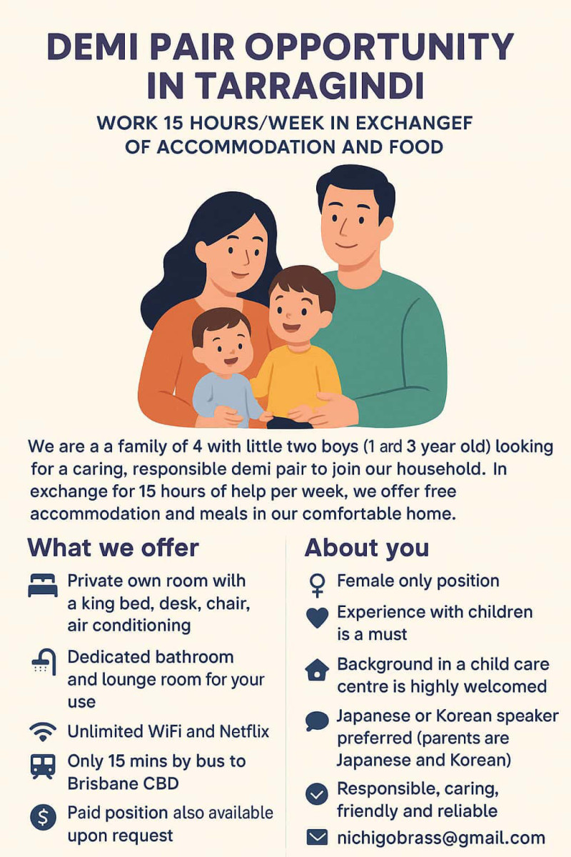 A Japanese/Korean couple with 2 boys (1 and 3 year old) looking for a demi pair
