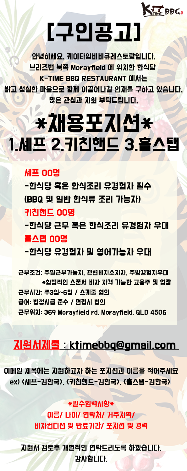 브리즈번 북쪽 Morayfield 에 위치한 한식당에서 직원을 모집합니다.