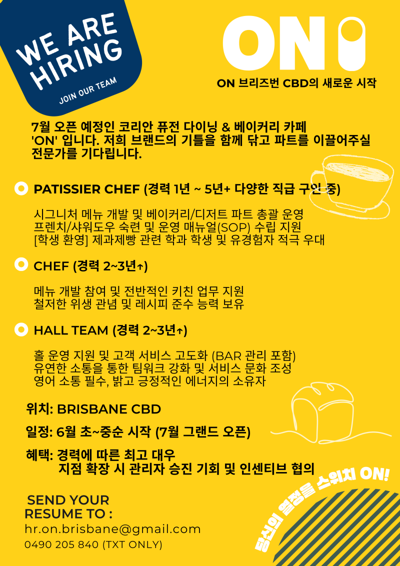 안녕하세요! 저희는 브리즈번 CBD에서 코리안 퓨전 요리와 특별한 베이커리·디저트를 선보일 설레는 첫걸음을 준비 중인 팀입니다. 저희 매장은 7월 오픈 예정이며, 선정되신 분들은 6월 초부터 매장 세팅 및 사전 근무를 함께 시작하시게 됩니다.