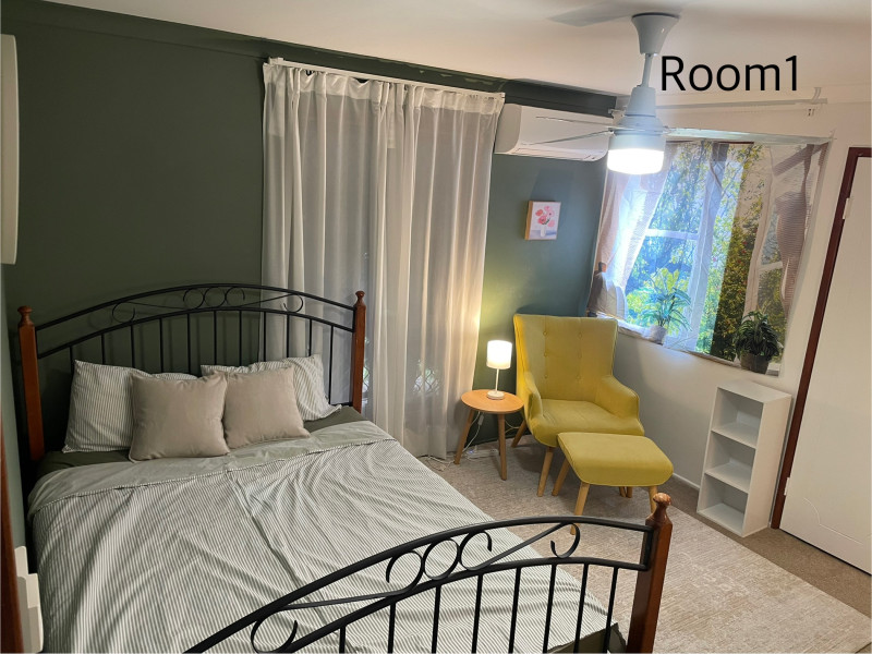 Room 1 : 3.5x3.5m room, carpet floor, provide key for room, full furnished (wardrobe, queen bed, chair and desk)