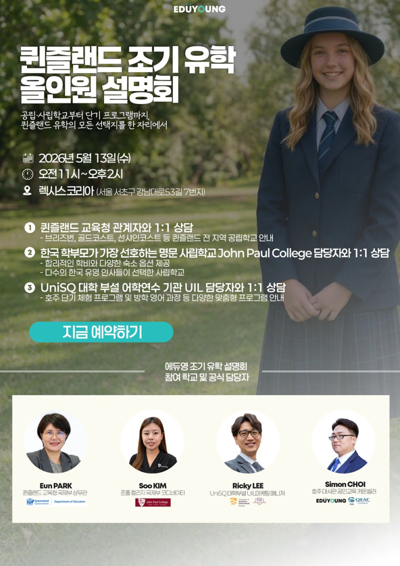 [호주조기유학] 2026년 5월 13일(수) 퀸즐랜드 조기유학 올인원 설명회