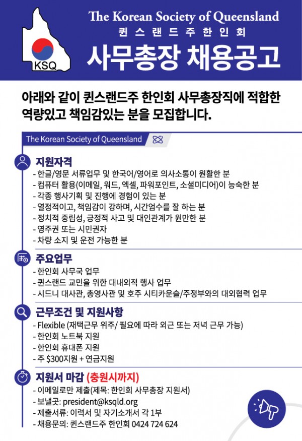 퀸스랜드주 한인회 소식<한인회관 대관업무 시작>코로나 바이러스로 인해 중단되었던 한인회관의 대관을 다시 시작합니다. 퀸스랜드주의 모든 교민분들의 대관을 환영하오니, 한인회관의 대관을 원하시는 개인이나 단체는 secretary@ksqld.org 로 문의하…