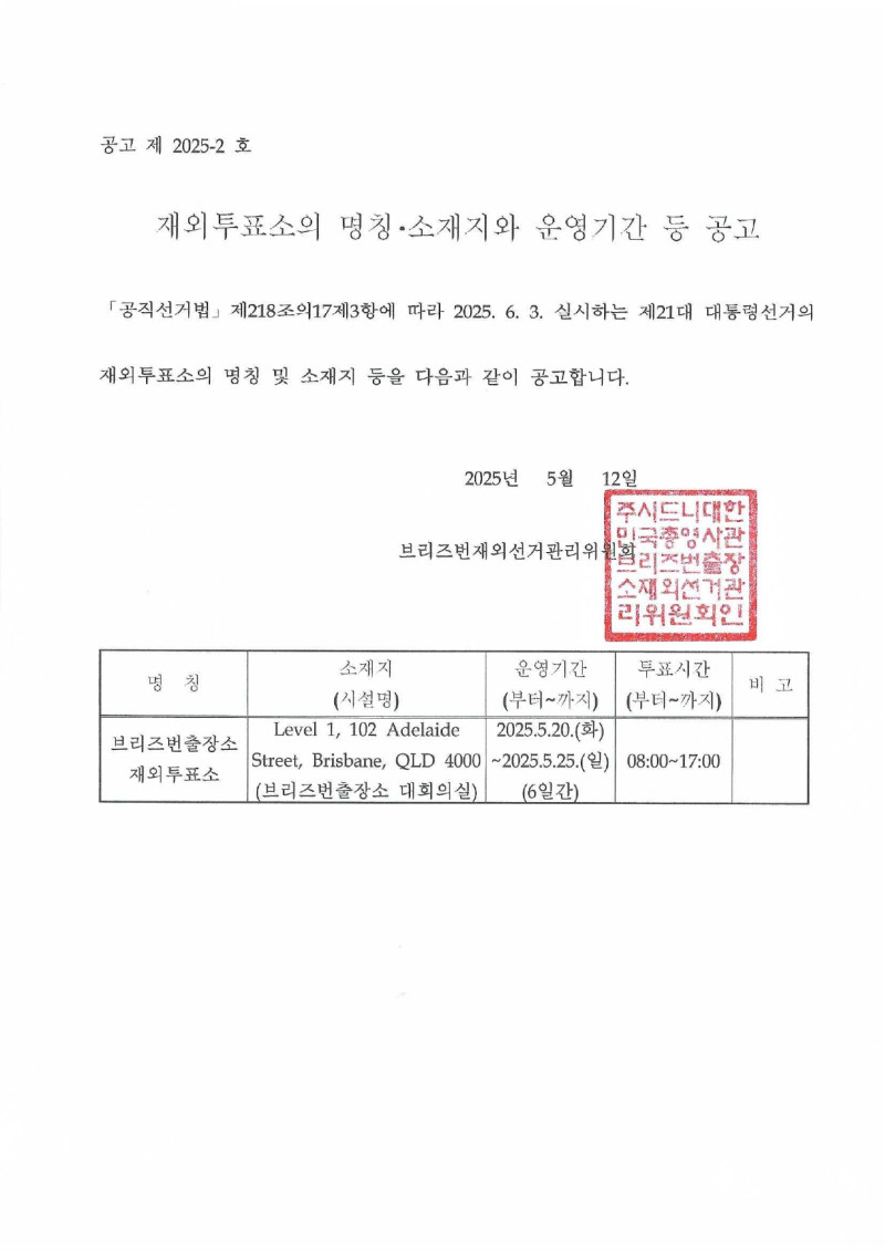 제21대 대통령 재외선거 투표소는 브리즈번출장소 대회의실에 설치 예정