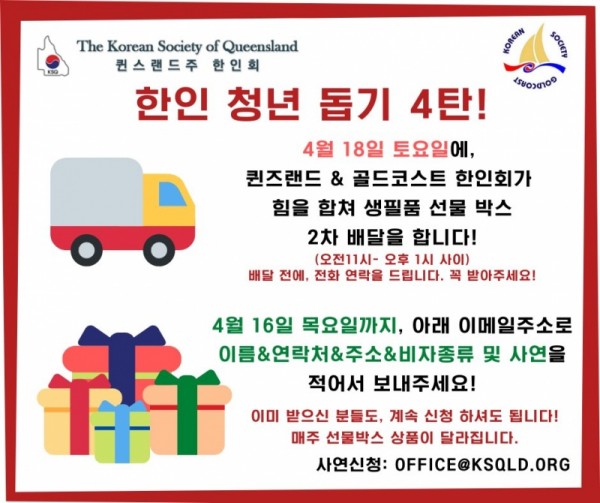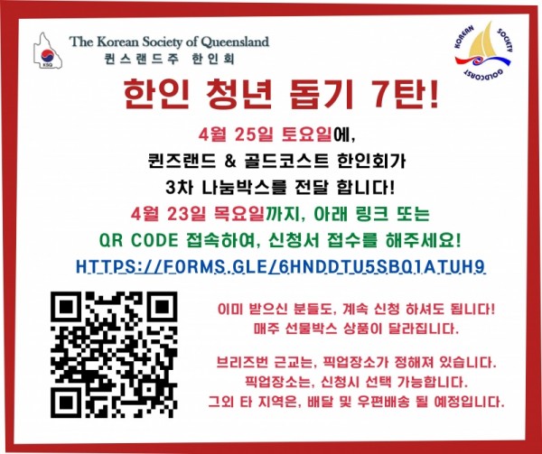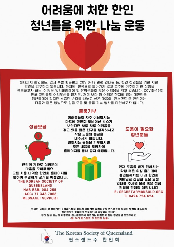 퀸스랜드주 한인회 소식<한인 청년 도움 운동>지난 4월 7일부터 시작된 한인청년 도움 운동은 코로나 19로 인해 일자리를 잃어 학비를 내지 못하거나 고국으로 돌아갈 방안을 구하지 못하여 어려움을 겪는 청년들을 위해, 작지만 소중한 손길로 교민들의 도움으로…