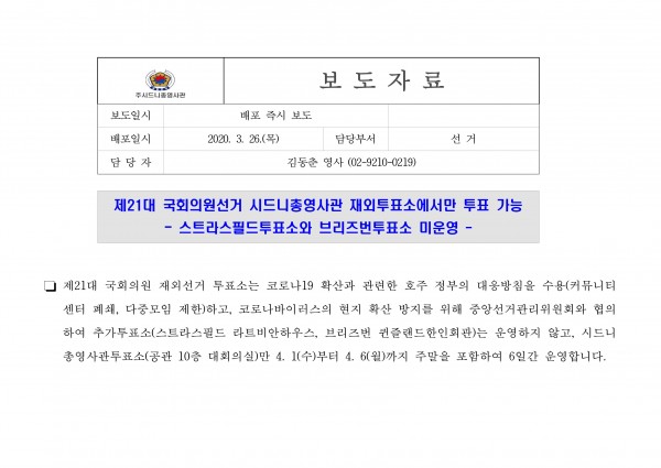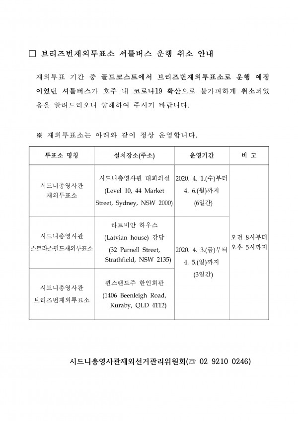 제21대 국회의원선거 브리즈번투표소 미운영, 시드니총영사관 재외투표소에서만 투표 가능제21대 국회의원 재외선거 투표소는 코로나19 확산과 관련한 호주 정부의 대응방침을 수용(커뮤니티센터 폐쇄, 다중모임 제한)하고, 코로나바이러스의 현지 확산 방지를 위해 중앙선거관리위원…