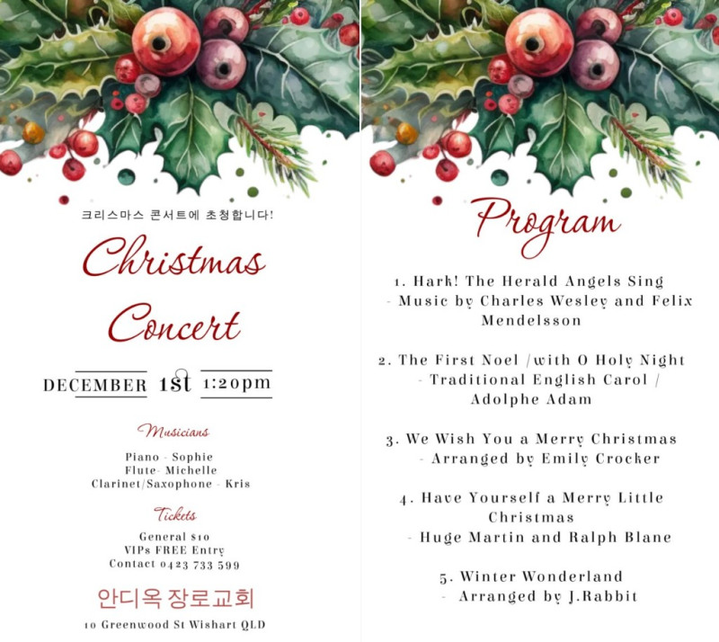 크리스마스 콘서트 (12월1일, 주일, 오후1:20분) 위샤트 안디옥장로교회 (St Johns Wishart 성공회 예배당)