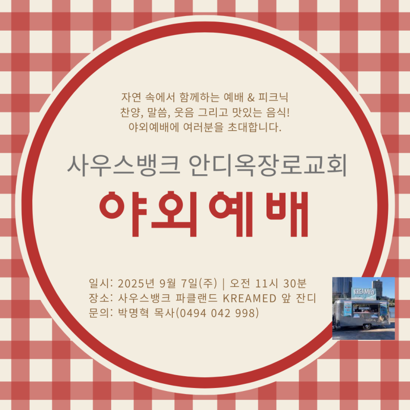 사우스뱅크 안디옥장로교회 야외예배에 초대합니다.