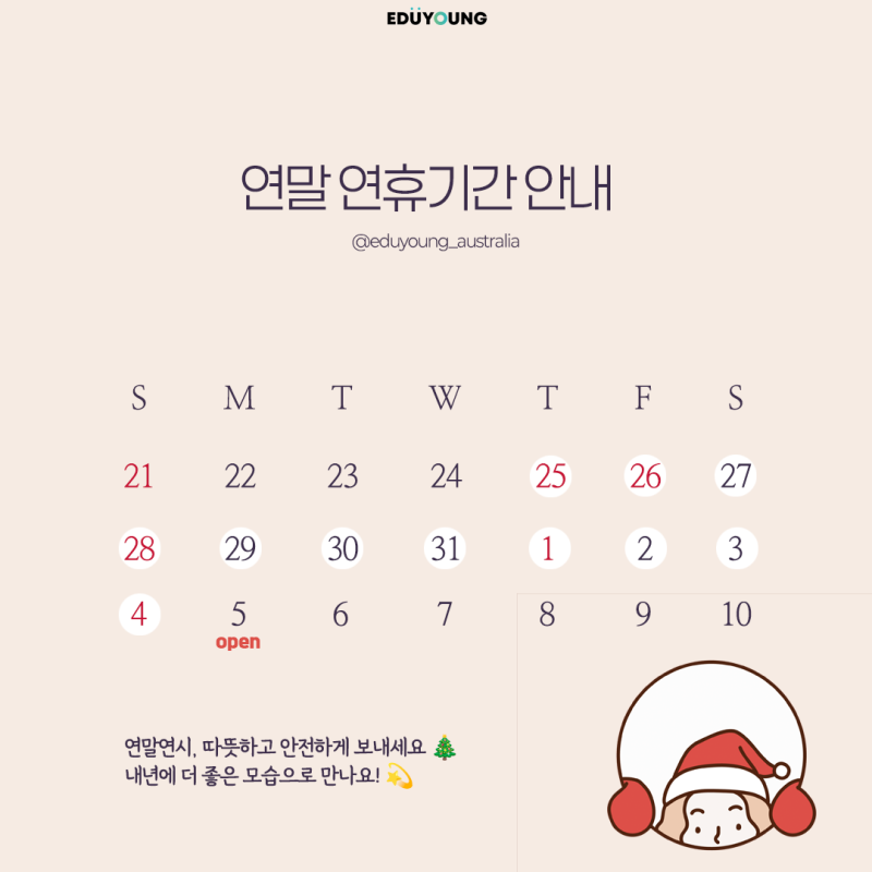 에듀영은 2025년 12월 25일 (목)부터 2025년 1월 4일 (일)까지 휴무입니다. 카카오톡 채널(에듀영닷컴_호주본사)통해 메세지 남겨 주시면 2025년 1월 5일(월)부터 순차적으로 답변드리도록 하겠습니다.