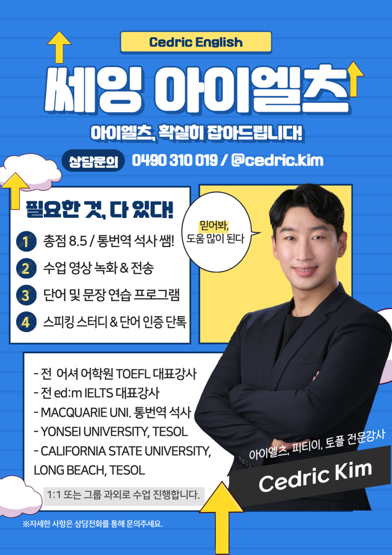 안녕하세요. 전(前) 강남 edm 아이엘츠 대표강사이자, 맥쿼리대학교 통번역 석사 Cedric입니다.