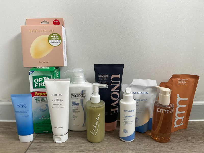 -리무브 스킨브라, 어노브 트리트먼트(320ml), 에스트라 로션(150ml+150ml), 프리메라 오일투폼(200ml+200ml), 티르티르 폼클렌징(150ml), 카카두 클렌저(200ml), 헤어플러스 단백질앰플(70ml), 옵티프리(470ml), 피지오겔 바디워시