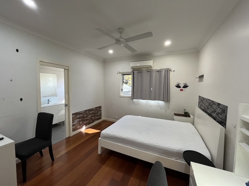 1,The Master room with walk-in and Ensuite: Queen bed, bed side, two sets of desks and chairs. air-condinioner, TV.