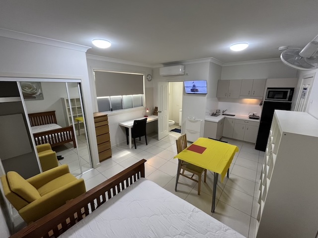 This Self-contained Studio flat is the integration with bathroom, kitchen, study and living area. and it is in the house dwelling style.