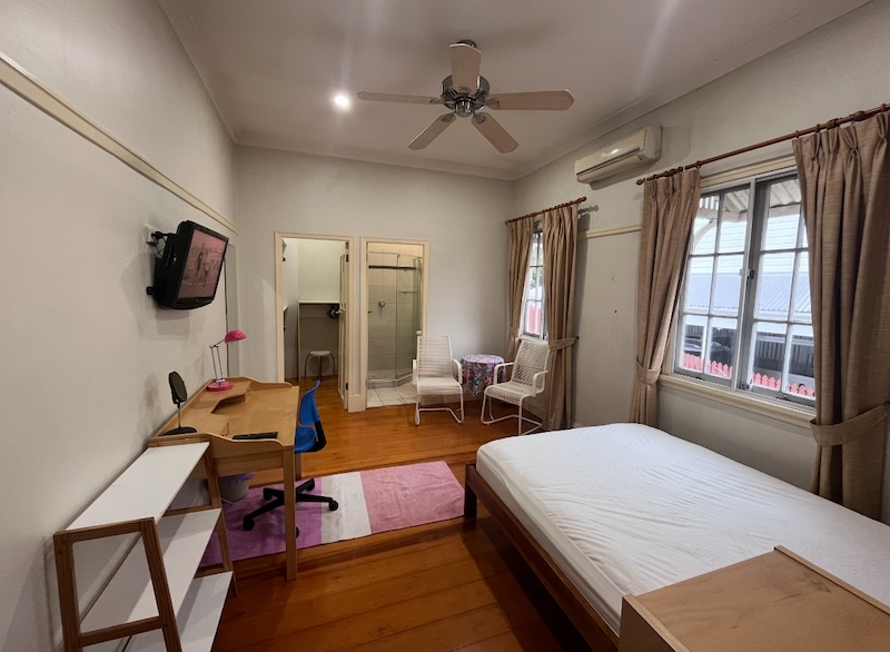 The huge master room, with en-suite ,walk-in, double bed, TV, air-conditioner, ceiling- fan, desk and chair. arm-chairs and coffee table. WiFi.