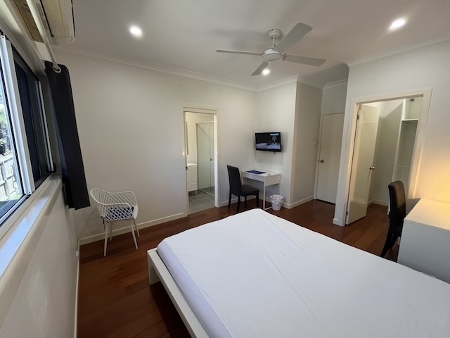 sunshine and big Master Rm with ensuite , equipped with Queen bed, walk-in wordrob, desks & chairs X2 sets,A/C ,TV, ceiling fan. WiFi.