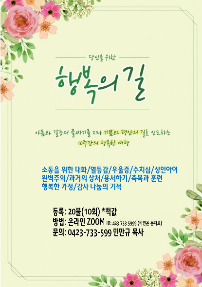 *신청: 0423-733-599 민만규 목사 (브리즈번 가정행복학교 상담센터 https://www.happy-school.co.kr/externalcenter)