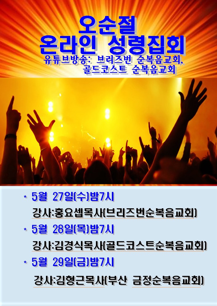 5월 27일(수)부터 29일(금) 저녁 7시에 오순절 온라인 성령집회가 열립니다.