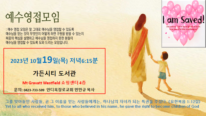 "천국은 무엇인가? 구원은 무엇인가? 어떻게 예수님을 믿는가? 죄로 부터 자유할 수 있는 길은 없는가? 이러한 질문에 대한 답으로 예수영접모임을 추천하면서 초청합니다. 먼저 전화를 주세요 0423-733-599 민만규 목사 (안디옥교회 민만규 목사)
