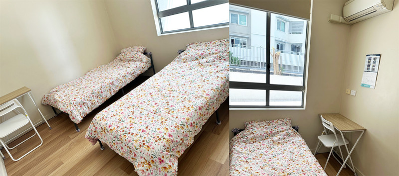 싱글침대 2개 (붙여써도 따로 써도 되는^^)와 침구류, 테이블 책상, 넉넉한 붙박이장 (천장이 높아 윗부분에 트렁크 보관 가능) 있습니다.