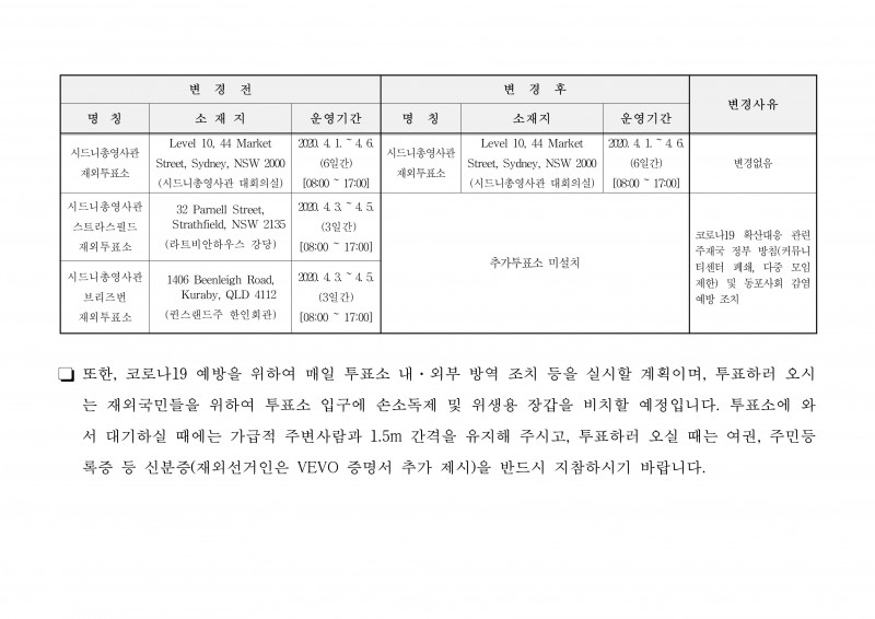 제21대 국회의원 재외선거 투표소는 코로나19 확산과 관련한 호주 정부의 대응방침을 수용(커뮤니티
