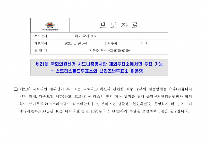 제21대 국회의원선거 브리즈번투표소 미운영, 시드니총영사관 재외투표소에서만 투표 가능제21대 국회의원 재외선거 투표소는 코로나19 확산과 관련한 호주 정부의 대응방침을 수용(커뮤니티센터 폐쇄, 다중모임 제한)하고, 코로나바이러스의 현지 확산 방지를 위해 중앙선거관리위원…