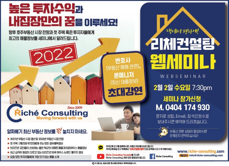 다년간의 자산상승을 이끌어온 부동산 컨설턴트, 변호사님, 론매니저 그리고 하우스빌더 함께 가장 유익한 정보를 세미나를 통해 알려드리겠습니다...
