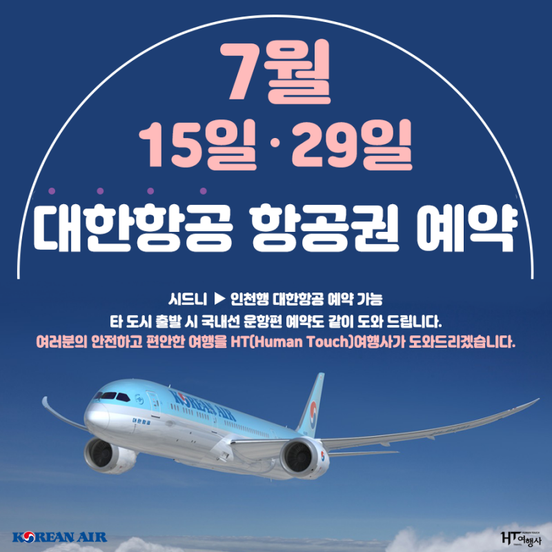 7월 15일 / 29일 대한항공 예약 접수 *NO DEPOSIT 시드니-인천