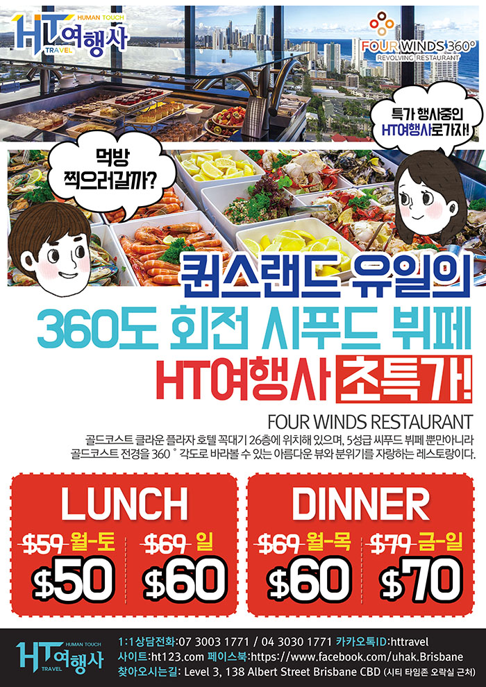 | 안녕하세요 HT여행사HT유학원입니다~ 퀸스랜드 유일의 360도 회전 시푸드 뷔페 초특가 이벤트를 진행중인데요~ 바우처 발급 및 궁금한 사항은 언제든 HT여행사에 문의주세요 ^^ *바우처문의* 사이트:http://www.ht123.com/ 카카오톡ID:httravel 문의전화: 07 3003 1771 / 04 3030 1771 오시는 길:Level 3, 138 Albert Street Brisbane CBD (시티 타임존 오락실 근처) |