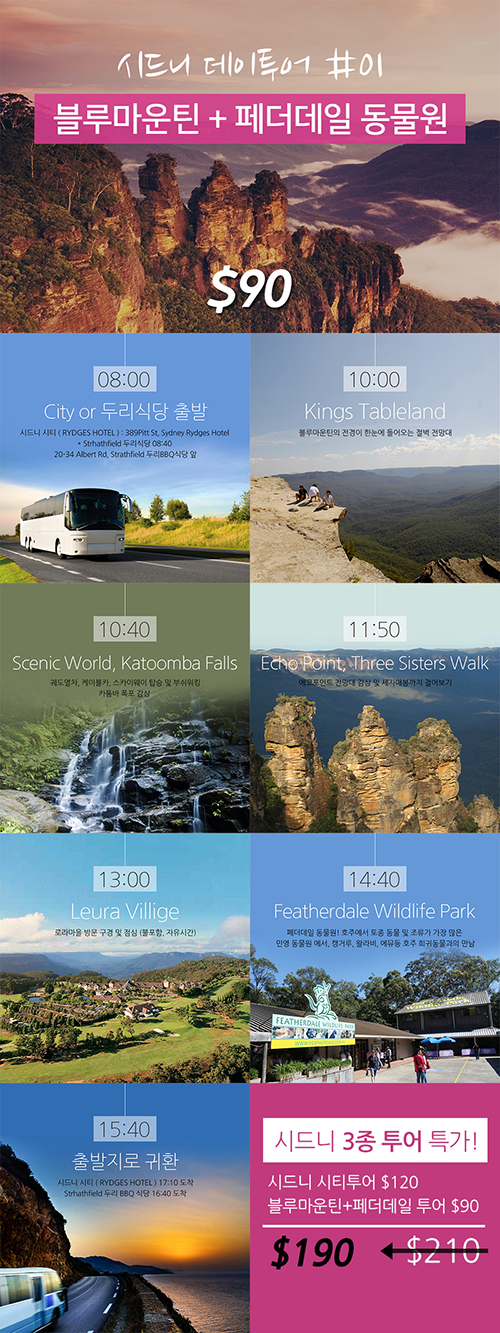 블루마운틴과 페더데일 동물원함께하는 하루투어 $90 입니다.