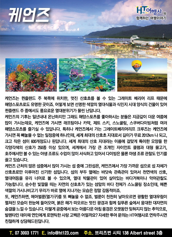 사무실위치: Level 3, 138 Albert Street Brisbane CBD (시티 타임존 오락실 근처) 호주 국내 여행 ㅣ 세계여행 ㅣ 전세계 항공 ㅣ 데이투어 ㅣ 크루즈여행 l 일반영어과정 ㅣ 대학과정 ㅣ 조기유학 ㅣ 장기비자 ㅣ 필리핀 |
