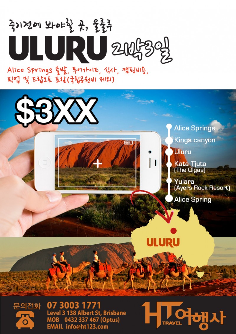 | 안녕하세요. 여러분의 소중한 추억을 함께하는 HT여행사 입니다. 호주까지 오셨으면 꼭 가봐야만 하는 곳, 세상의 중심 울룰루로 초대합니다! ■ 2박3일 캠핑투어 (앨리스스프링 인/아웃) ■ 투어가이드/식사/캠핑비용/숙소 픽업,드롭오프 포함 ■ 국립공원비 $25 불포함 자세한 일정은 문의주세요! 문의: 07 3003 1771 / 0430 30 1771 / 카톡ID: httravel / 이메일 info@ht123.com 사무실위치: Level 3, 138 Albert Street Brisbane CBD (시티 타임존 오락실 근처) |
