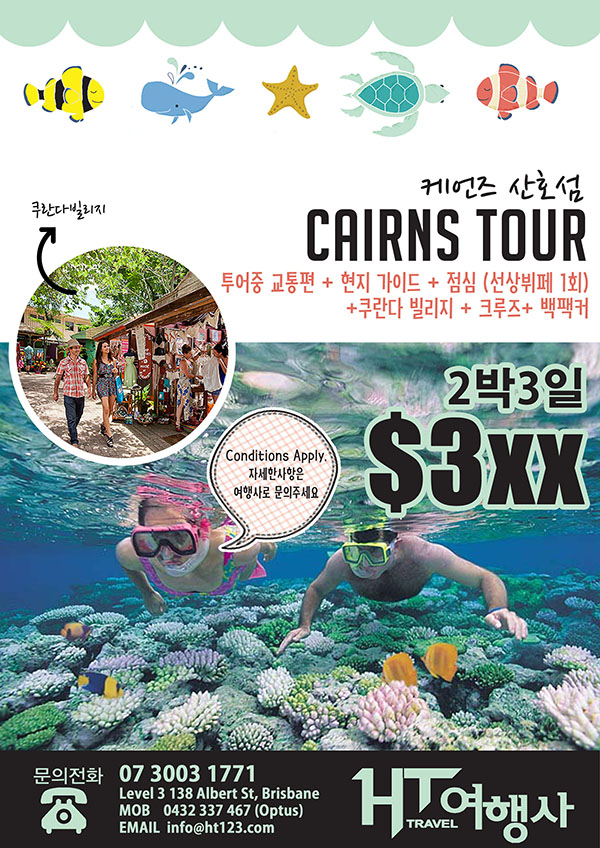 | 안녕하세요. 여러분의 소중한 추억을 함께하는 HT여행사 입니다. 이제 다시 여름이 다가오고 있는 만큼 케언즈 투어 문의가 점점 많아지고 있는데요 쿠란다 빌리지와 함께 그레이트배리어리프까지 즐기실 수 있는 숙소 포함 패키지 특가가 나왔습니다! 그 외 데이투어도 있으니 자세한 포함 사항과 일정은 전화 혹은 이메일로 문의 주세요 문의: 07 3003 1771 / 0430 30 1771 / 카톡ID: httravel / 이메일 info@ht123.com 사무실위치: Level 3, 138 Albert Street Brisbane CBD (시티 타임존 오락실 근처) |
