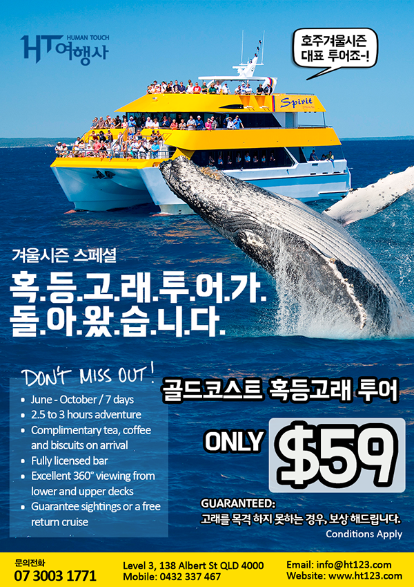 | 안녕하세요. 여러분의 소중한 추억을 함께하는 HT여행사 입니다. 겨울에만 볼 수 있는 혹등고래 투어! 아직 못보셨다면 이 겨울이 가기전에 서두르세요. 골드코스트 씨월드 근처에서 매일 출발합니다 :) 자세한 내용은 문의주세요 문의: 07 3003 1771 / 0430 30 1771 / 카톡ID: httravel / 이메일 info@ht123.com 사무실위치: Level 3, 138 Albert Street Brisbane CBD (시티 타임존 오락실 근처) |