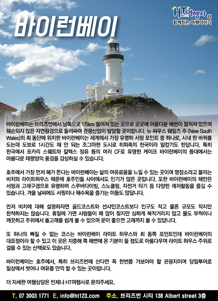 문의: 07 3003 1771 / 0430 30 1771 / 카톡ID: httravel / 이메일 info@ht123.com 사무실위치: Level 3, 138 Albert Street Brisbane CBD (시티 타임존 오락실 근처) 호주 국내 여행 ㅣ 세계여행 ㅣ 전세계 항공 ㅣ 데이투어 ㅣ 크루즈여행 l 일반영어과정 ㅣ 대학과정 ㅣ 조기유학 ㅣ 장기비자 ㅣ 필리핀 |