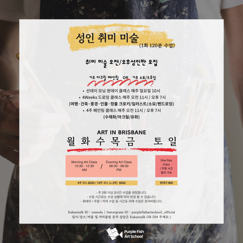 Purple Fish Art School에서 성인을 위한 취미 미술 클래스를 모집합니다!